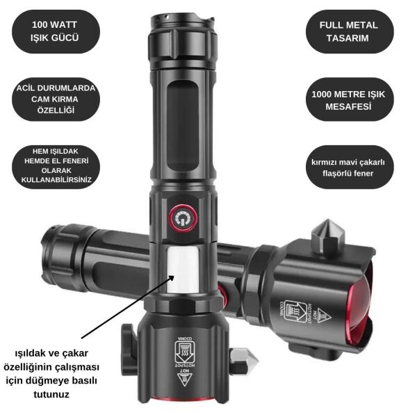 Özellikler: Güvenlik çekiçleri, kesiciler, COB yan ışık, güç bankası, acil kurtarma, kaçış